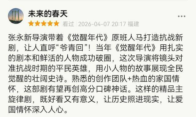 张永新导演带着《醒觉年代》原班东说念主马打造抗战新剧,让东说念主直呼"爷青回"!过去《醒觉年代》用塌实的脚本和鲜嫩的东说念主物得手破圈,此次导演将镜头瞄准抗战时刻的苍生英杰,用常人物的故事展现全民醒觉的壮阔史诗。老练的创作团队+热血的家国情感,这部剧有望再创高分口碑别传。这么的极品主旋律剧,既好意思瞻念又专门想,让历史照进本质,让爱国情感久了东说念主心。